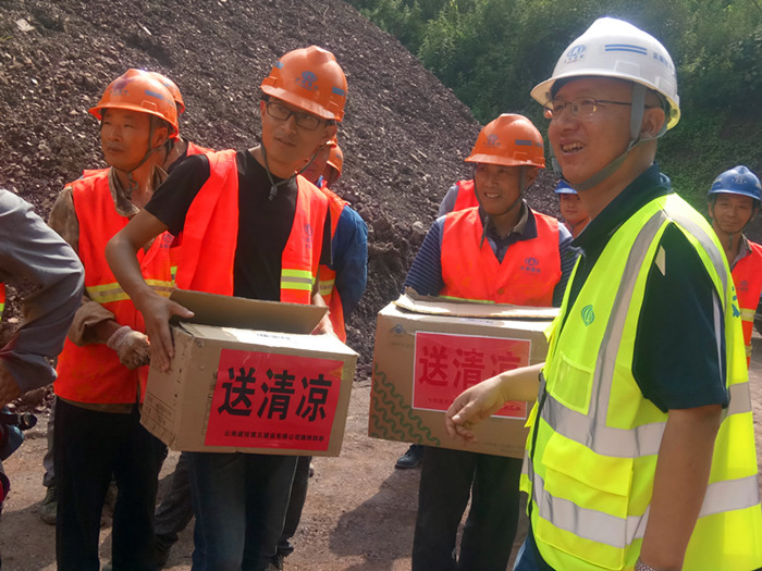 慰問組走進(jìn)項(xiàng)目各個(gè)施工點(diǎn),與職工們交流,了解其生產(chǎn)生活近況,并送上慰問品,“送清涼”慰問品包括解暑茶、防蚊蟲噴劑以及防暑藥品等。