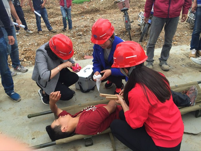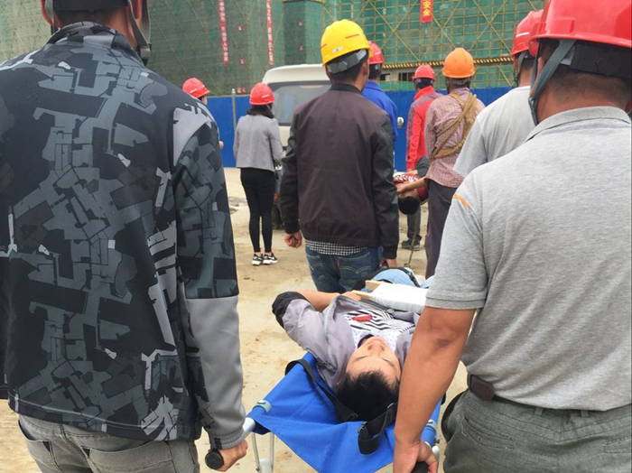 此次演練以腳手架坍塌高處墜落事故為背景展開,“事故”發(fā)生后施工現(xiàn)場負責人立即組織搶險救災工作,向醫(yī)院請求醫(yī)護救援,同時向項目安全總監(jiān)報告;項目部安全總監(jiān)立即向公司安監(jiān)部報告事故發(fā)生情況。一線管理人員及應急小組按照現(xiàn)場救援指揮部的指示及《腳手架坍塌事故應急救援預案》的要求行動,開展救援工作。