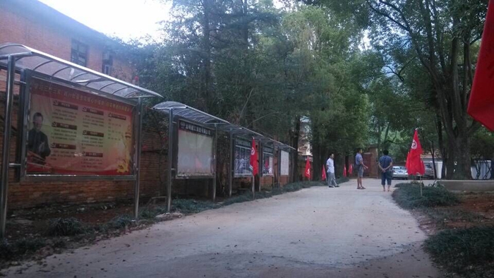 駐地辦公區(qū)印有“云南建工”標(biāo)識(shí)的小紅旗、安全標(biāo)語(yǔ)及宣傳欄
