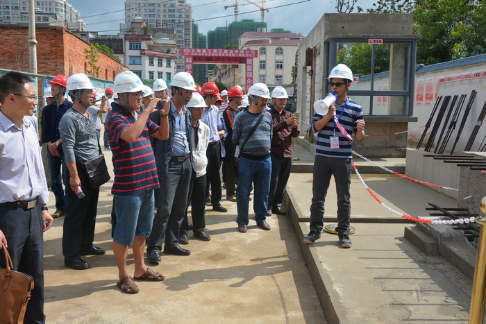 會前,來自玉溪市八縣一區(qū)質(zhì)監(jiān)系統(tǒng)的相關(guān)人員參觀了正在施工的工地現(xiàn)場,了解了項目部在質(zhì)量通病治理的相關(guān)措施,重點(diǎn)學(xué)習(xí)了項目工序樣板區(qū)、鋁合金模板的使用情況和成效。