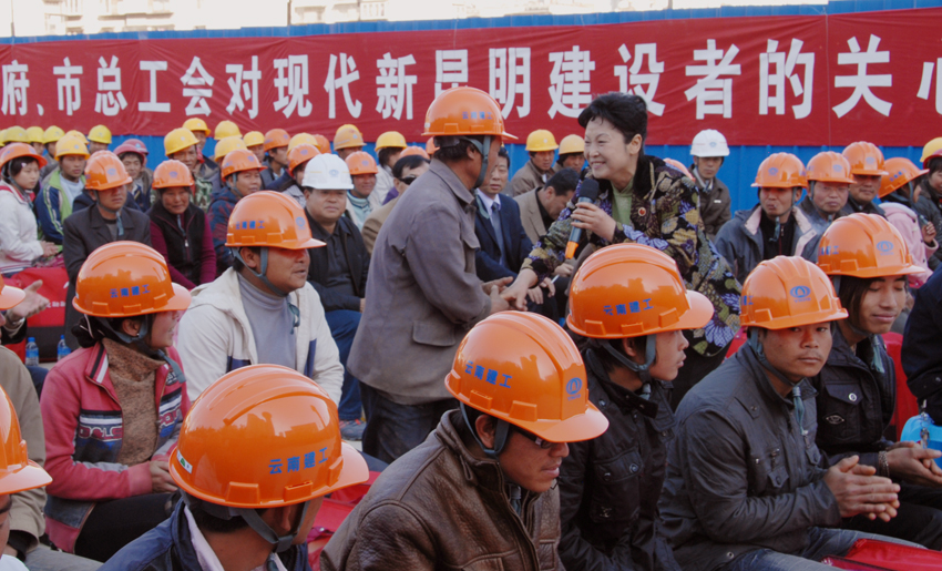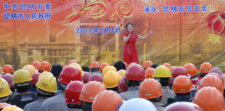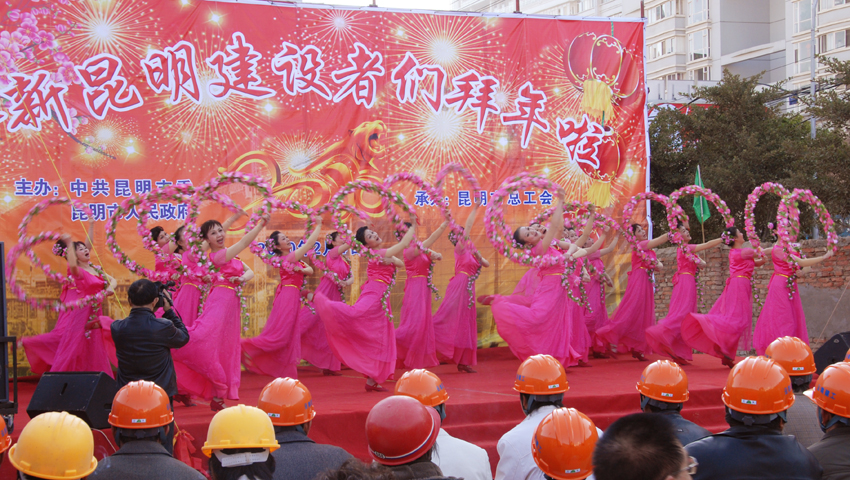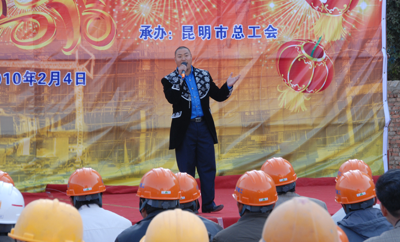 2月4日上午,受昆明市委、市政府委托,昆明市總工會主席楊麗等領(lǐng)導(dǎo)同志率團到云南建工第五建設(shè)有限公司昆明工人文化宮建設(shè)工地,給包括農(nóng)民工在內(nèi)的新昆明建設(shè)者拜年,給建設(shè)者送來新春的祝福和溫暖的禮品。楊麗主席和工會干部以及昆明市楓葉職工藝術(shù)團的演員們分別獻上精彩的歌舞。