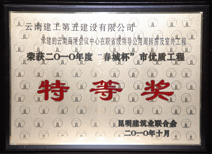 公司承建的云南海埂會(huì)議中心在職省級(jí)領(lǐng)導(dǎo)公用周轉(zhuǎn)房及室外工程榮獲2010年度“春城杯”市優(yōu)質(zhì)工程特等獎(jiǎng)