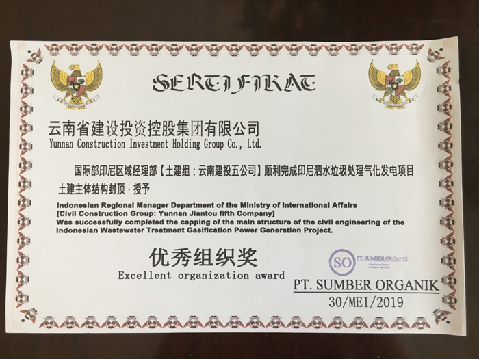 公司印尼泗水垃圾處理廠氣化發(fā)電項目獲優(yōu)秀組織獎