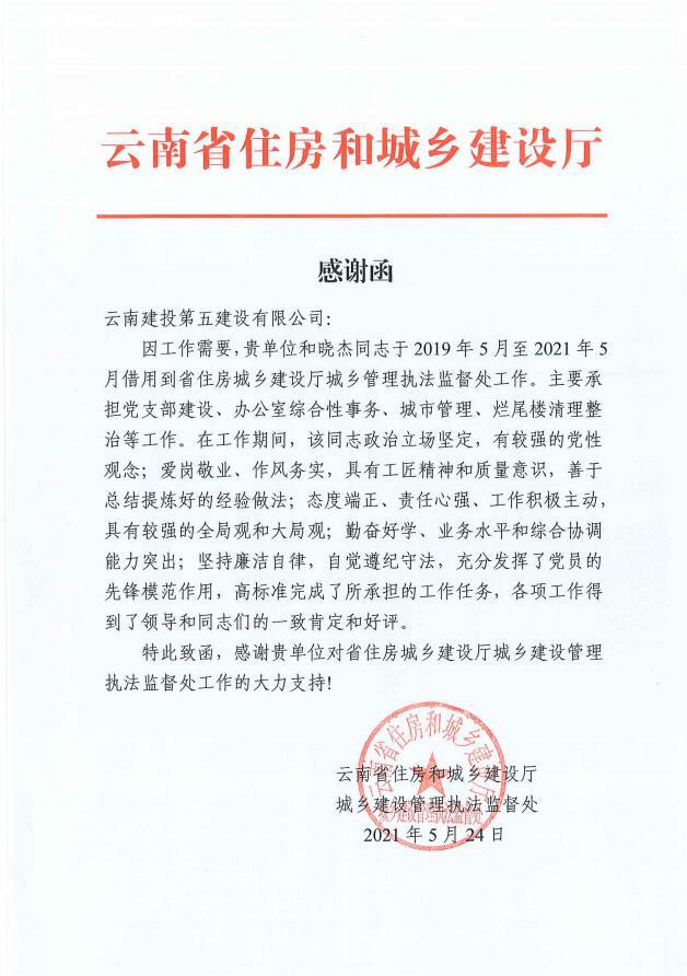 近日,公司收到云南省住房和城鄉(xiāng)建設(shè)廳感謝函,感謝公司職工和曉杰在借調(diào)其城鄉(xiāng)管理執(zhí)法監(jiān)督處工作期間的優(yōu)異表現(xiàn)。和曉杰在工作期間認(rèn)真負(fù)責(zé),高標(biāo)準(zhǔn)完成了所承擔(dān)的工作任務(wù),得到了領(lǐng)導(dǎo)和同志們的一致肯定和好評。
