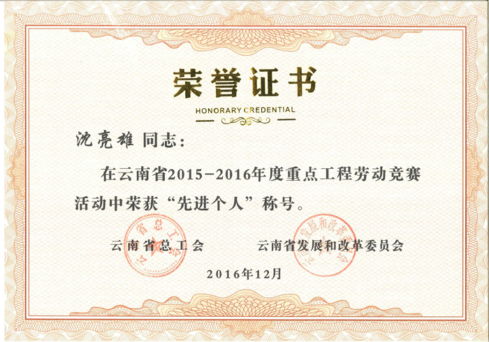 沈亮雄獲云南省重點(diǎn)工程勞動(dòng)競賽“先進(jìn)個(gè)人”稱號(hào)