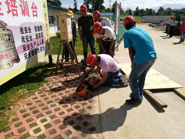 演練模擬了施工現(xiàn)場工人觸電救援的過程。一名工人在接電時(shí)不小心被電傷,在第一時(shí)間發(fā)現(xiàn)被電傷工人后,到場的人員立即將傷者迅速脫離電源并拉閘斷電,隨即撥打電話通知應(yīng)急救援小組成員進(jìn)行搶救。