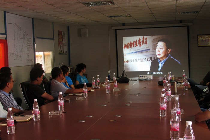 活動中,調(diào)研組成員還與項目部管理人員一同在懸掛著“安全生產(chǎn)月”活動的會議室中,集體學習了 “習近平總書記關于安全生產(chǎn)重要講話精神”一文,并觀看了“依法治安的法律重器-聚焦《安全生產(chǎn)法》”安全月主題宣傳片。