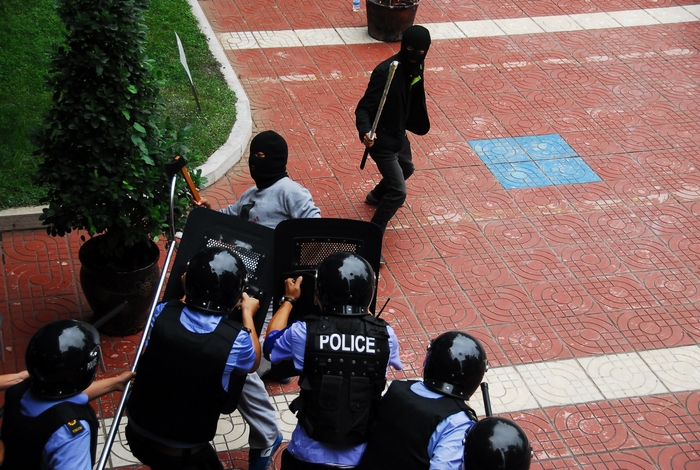 暴恐分子猛擊辦公樓大門及窗戶,并開始縱火、打砸物品。2分鐘后,黑林鋪派出所的特勤人員趕到案發(fā)現(xiàn)場,迅速組織兩隊(duì)人馬從兩側(cè)面包抄,公司保衛(wèi)部從正面出擊,在三隊(duì)人員的密切配合下,最終擊斃兩名暴恐分子,一名被擊中腿部,另一名則棄武器投降。