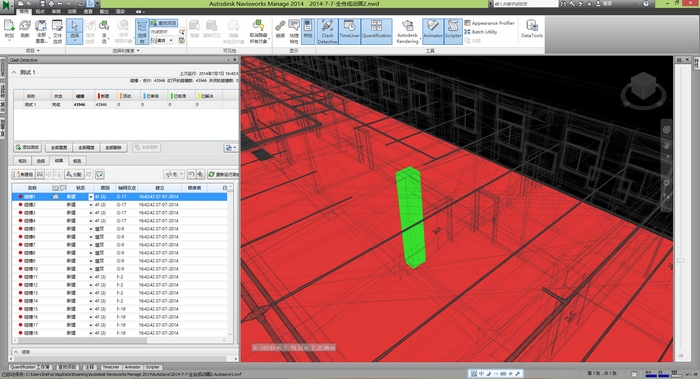 在集團(tuán)組建了BIM工作站后,公司技術(shù)中心按照要求于2014年4月正式成立了BIM工作室,目前建模人員2人(土建專業(yè)1人,水電專業(yè)1人)。公司根據(jù)BIM技術(shù)運(yùn)用的特點(diǎn)和新開項(xiàng)目實(shí)際,選取保山醫(yī)院門診樓項(xiàng)目作為首個BIM技術(shù)研究的試點(diǎn)工程,并于2014年5月1日開始模型繪制,至同年6月30日完成模型初稿繪制,耗時2月,分專業(yè)、分系統(tǒng)完成工程信息模型的建立,在模型碰撞檢查中發(fā)現(xiàn)43946個碰撞,其中真實(shí)碰撞點(diǎn)25000余個。