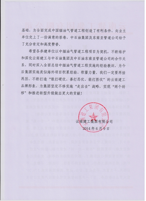 集團(tuán)致中緬原油管道工程馬德島項(xiàng)目參建單位的賀信