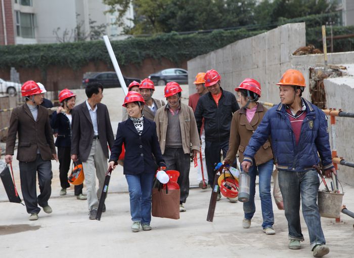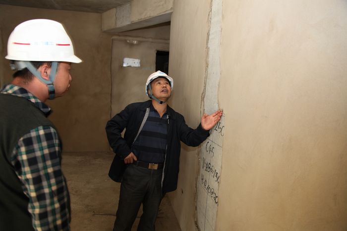 公司董事長李文智正在認(rèn)真查看內(nèi)墻抹灰情況