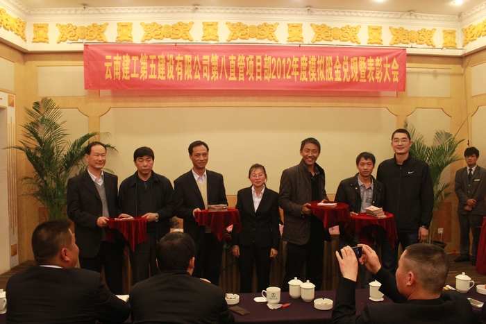 第八直管項(xiàng)目部本次兌現(xiàn)和獎(jiǎng)勵(lì)的金額共計(jì)220萬余元,對在2012年繳納了模擬股金的50余名職工進(jìn)行兌現(xiàn),對2012年業(yè)績突出、工作表現(xiàn)較好的48名員工、4名優(yōu)秀通訊員、1名優(yōu)秀團(tuán)干事、1名優(yōu)秀工會(huì)干事進(jìn)行獎(jiǎng)勵(lì)。由于部分員工還堅(jiān)守在綏江項(xiàng)目部,作為領(lǐng)獎(jiǎng)代表的項(xiàng)目經(jīng)理直呼“簽字好累,獎(jiǎng)狀太多拿不動(dòng)?!贝蠹覛g聲笑語,共享發(fā)展成果。