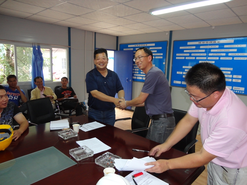 第五直管部經(jīng)理李興奎(左)與各項目部項目經(jīng)理、相關(guān)部門負責人簽訂責任狀(一)
