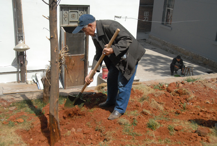 圖為公司退休老職工在為樹苗培土。