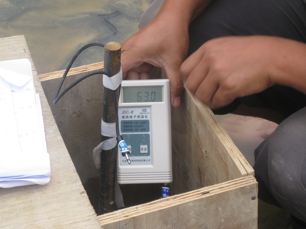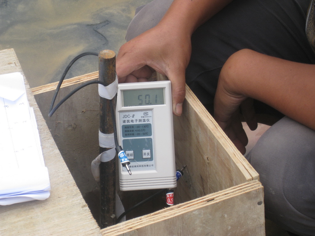 根據(jù)我公司大體積混凝土施工的成功經(jīng)驗(yàn),在澆灌混凝土之前編制了基礎(chǔ)大體積混凝土施工方案,采取優(yōu)化配合比設(shè)計(jì)、設(shè)置澆筑分倉縫,合理確定澆灌順序,保證筏板不出現(xiàn)冷縫,采用蓄水保溫養(yǎng)護(hù)法,并根據(jù)規(guī)范要求布置了7個(gè)測溫點(diǎn)。
