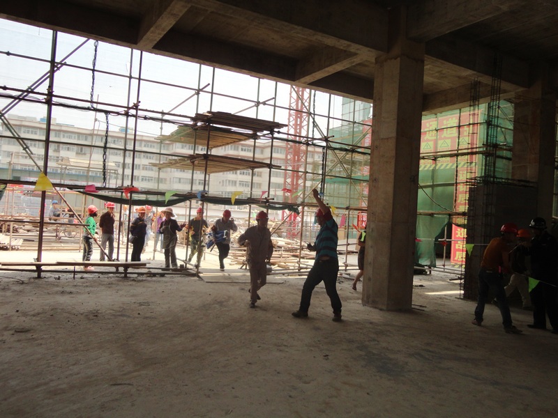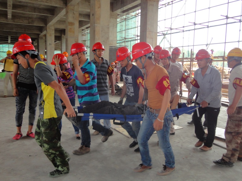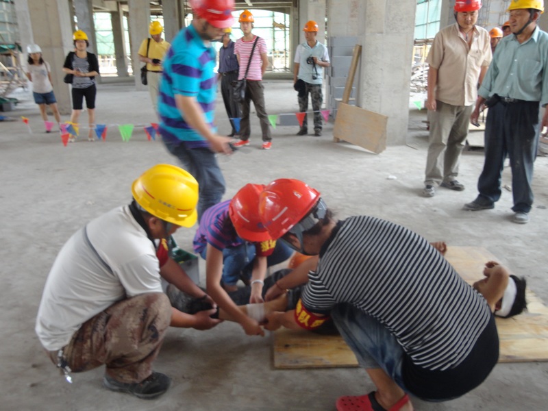 “事故”發(fā)生后,項(xiàng)目部安全員李福第一時(shí)間向項(xiàng)目部經(jīng)理董波匯報(bào),董波立即向上級(jí)部門匯報(bào)情況,并撥打了120急救電話,隨后立即指揮應(yīng)急救援小組開(kāi)展救援?,F(xiàn)場(chǎng)保衛(wèi)人員拉起警戒線維持現(xiàn)場(chǎng),搶救小組趕到事故現(xiàn)場(chǎng)拆除坍塌模板解救受傷人員,并對(duì)傷員傷口進(jìn)行簡(jiǎn)單的處理與包扎,等待救護(hù)車的到來(lái)……整個(gè)演練過(guò)程歷時(shí)二十多分鐘,大家有條不紊地參與了整個(gè)救援過(guò)程。