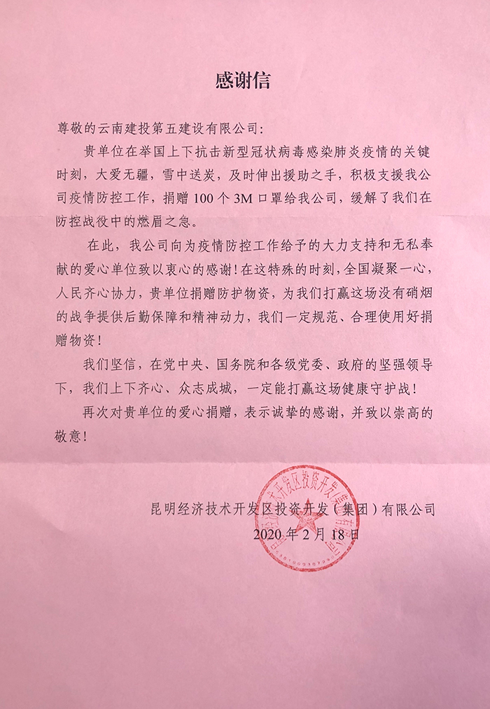 【共同戰(zhàn)疫】捐贈防護物資 公司收獲昆明經(jīng)投感謝信