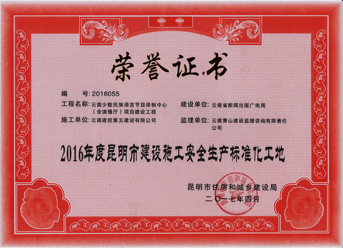 公司榮獲昆明市2016年度建設企業(yè)安全生產(chǎn)和工程質(zhì)量管理“先進單位”榮譽